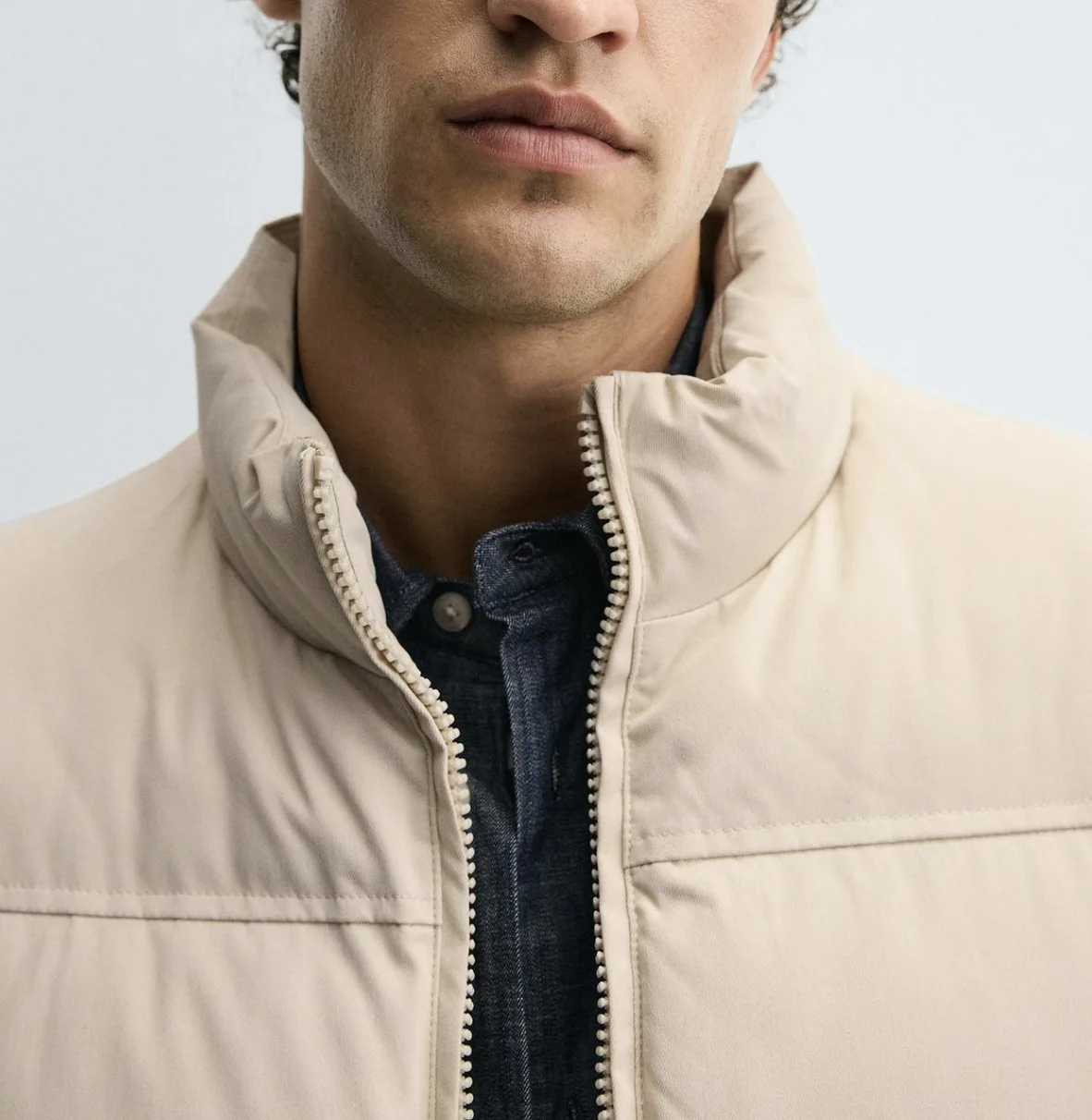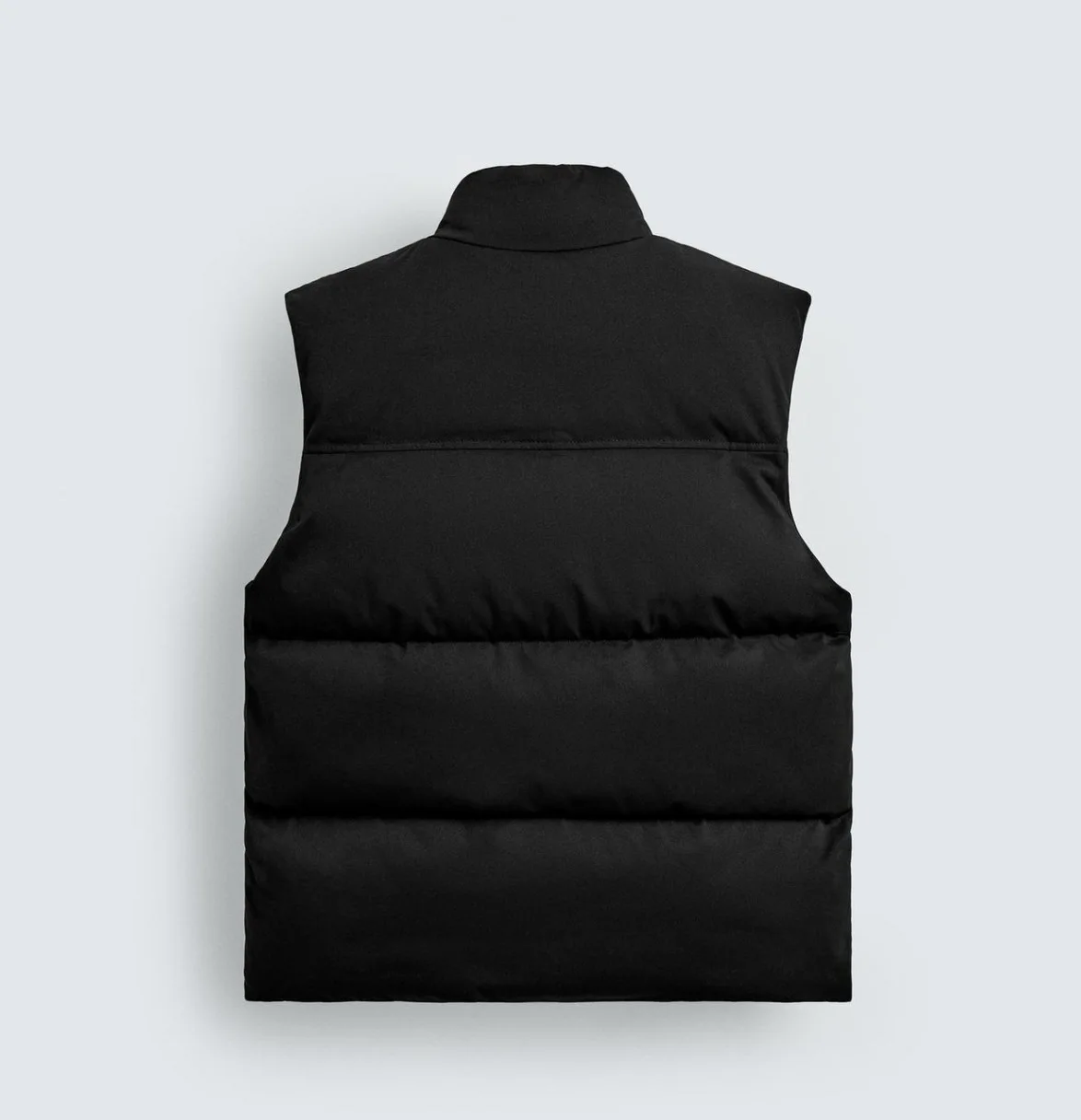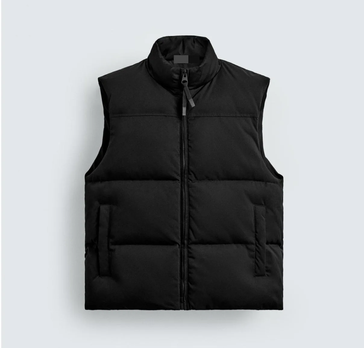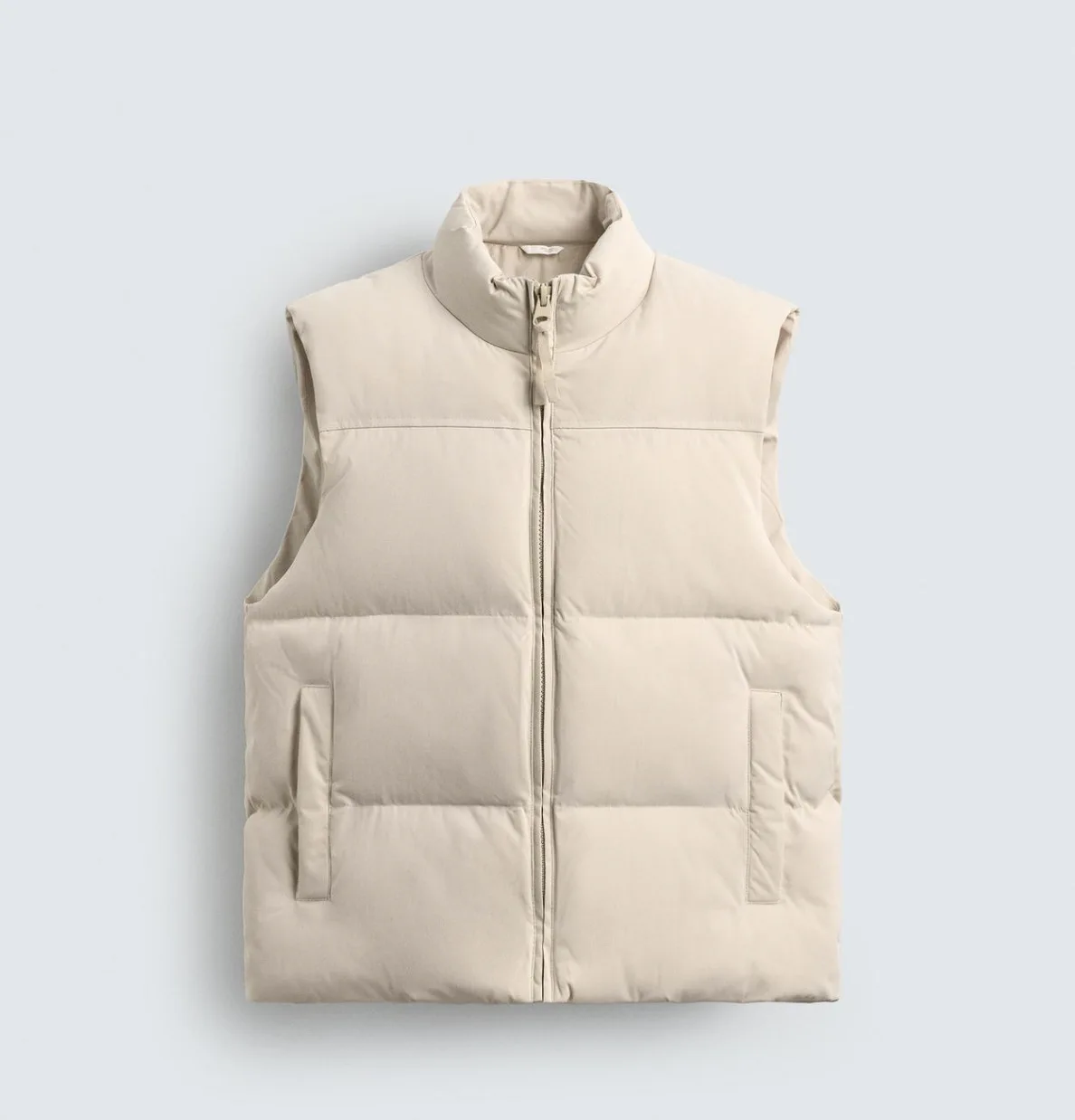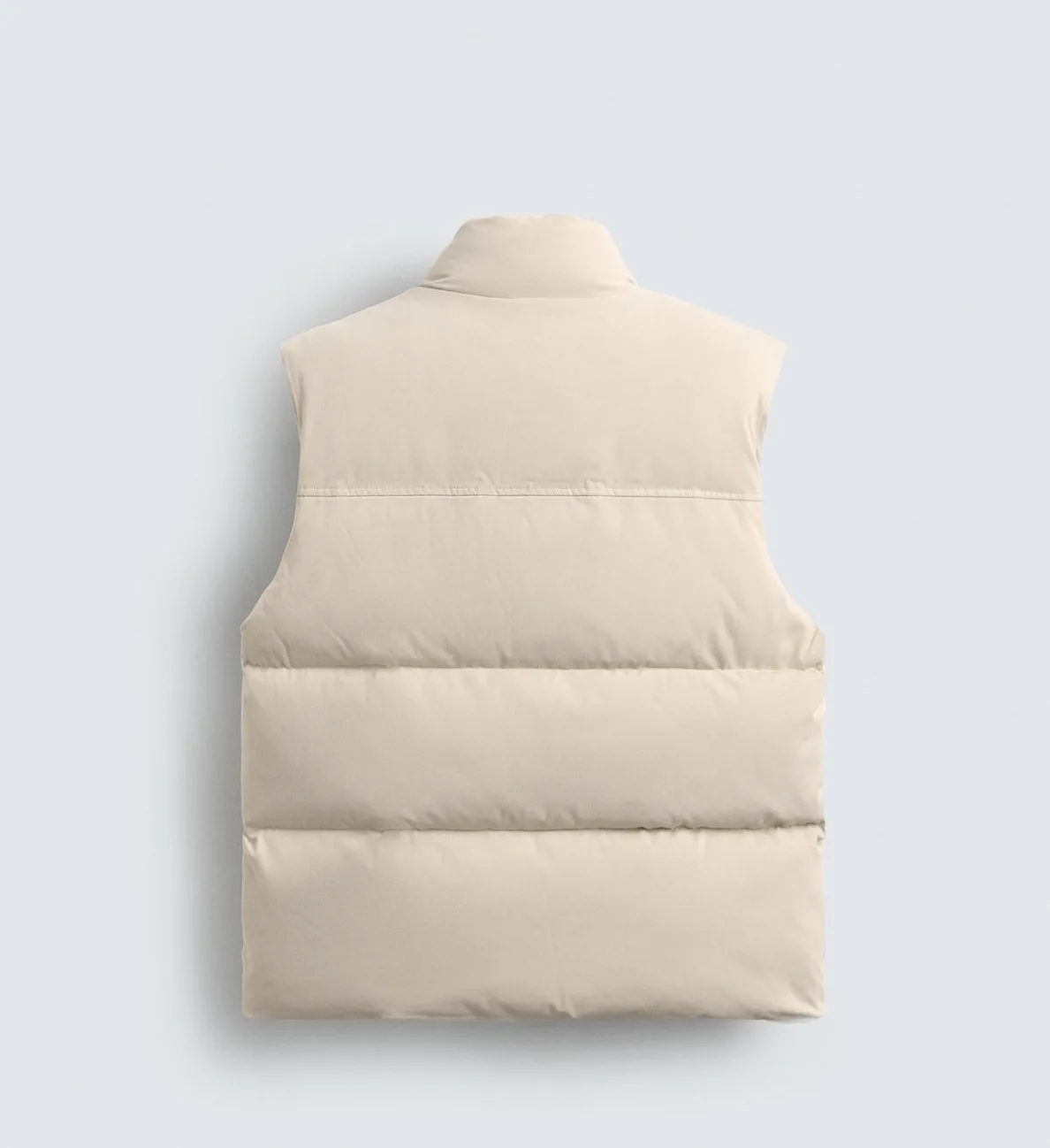 Vest. Høy krage og ermeløs, ermesøm. Paspel-lommer på hoftene. Lommedetalj på innsiden. Glidelås foran.