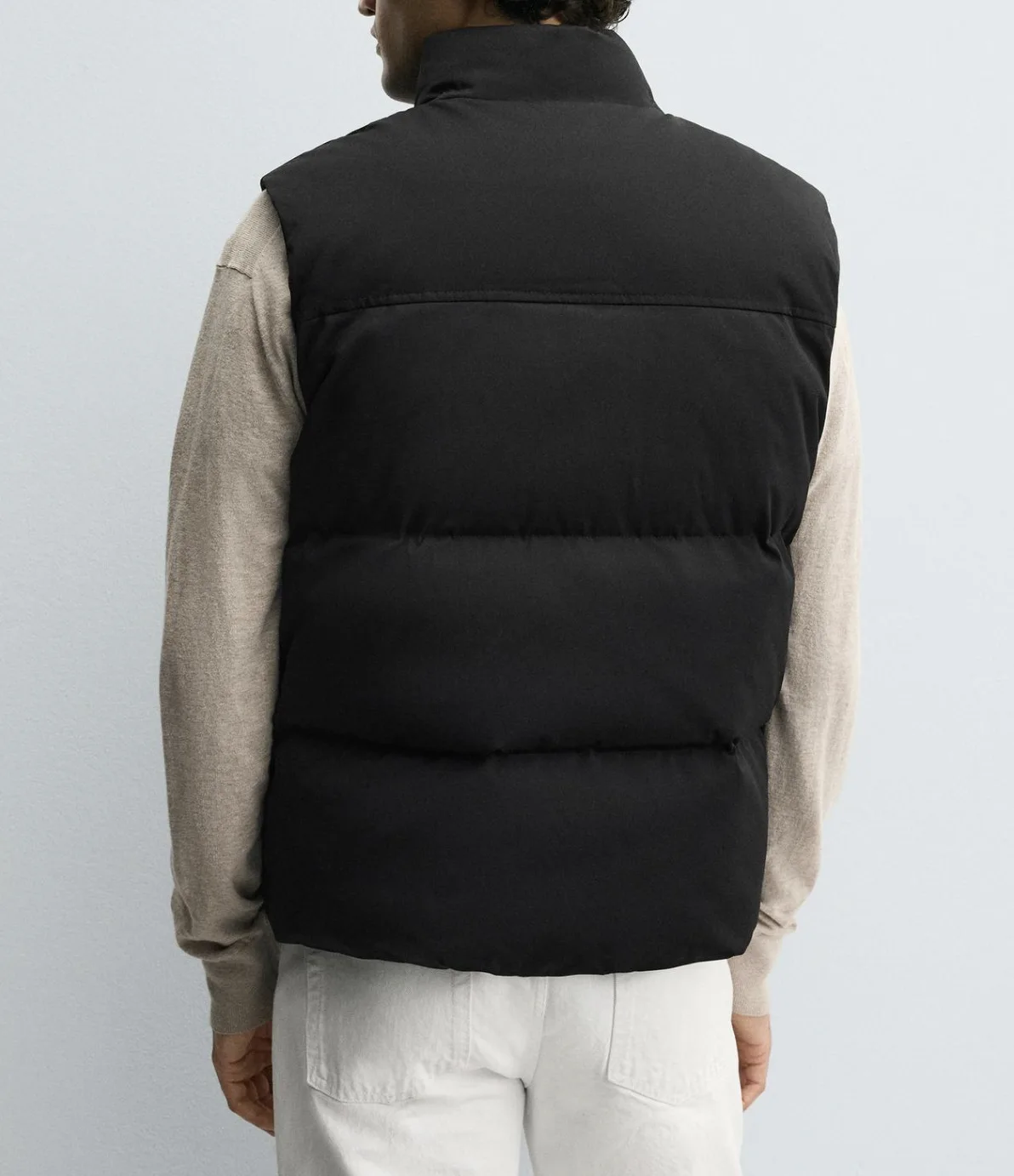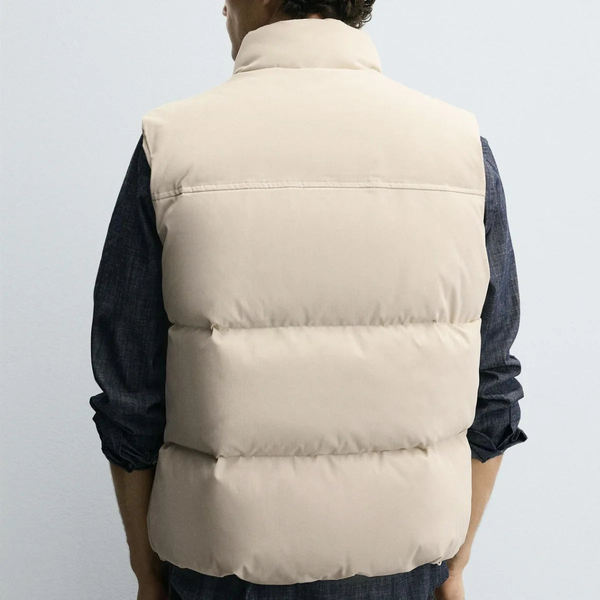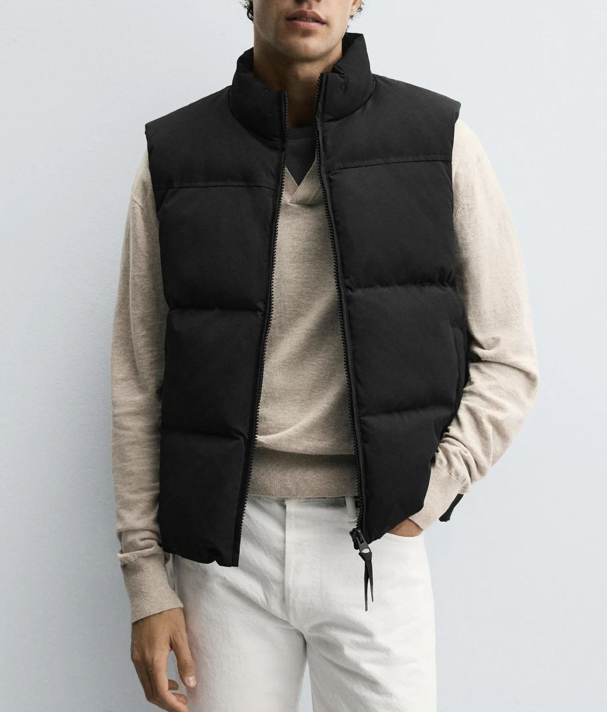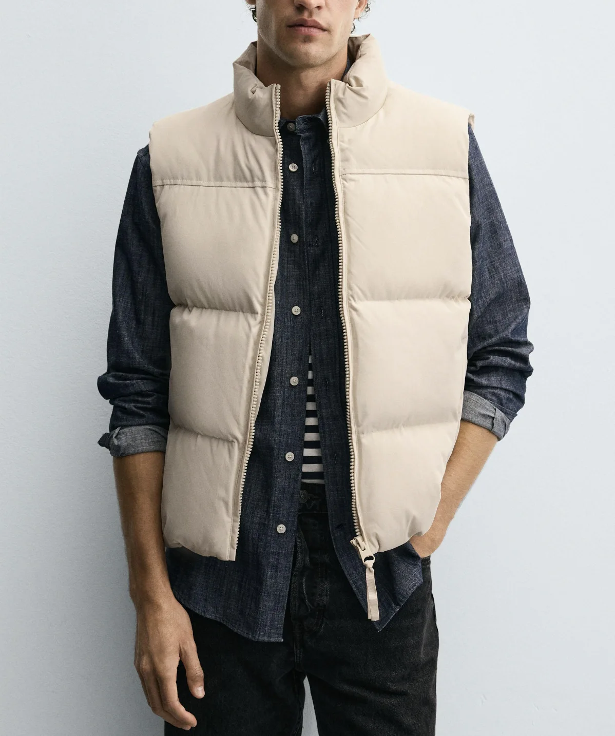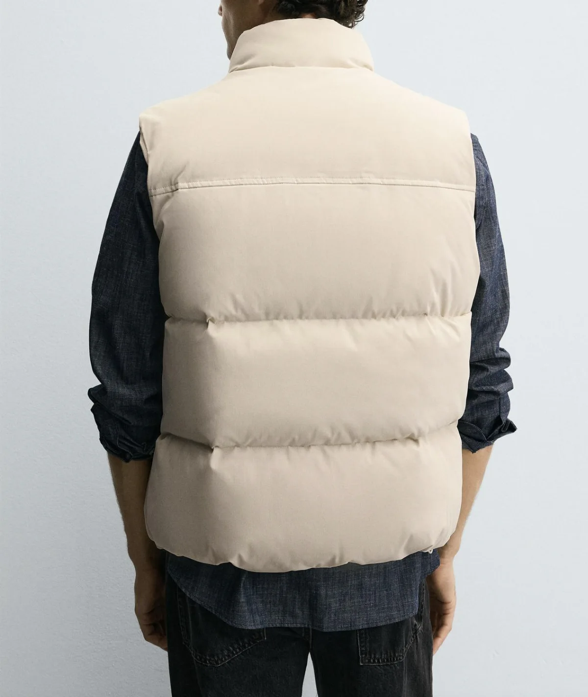 Vest. Høy krage og ermeløs, ermesøm. Paspel-lommer på hoftene. Lommedetalj på innsiden. Glidelås foran.