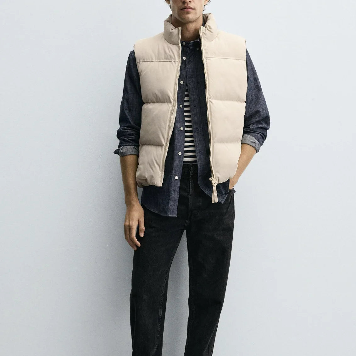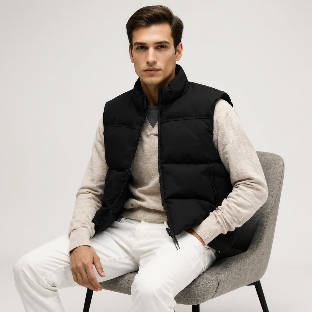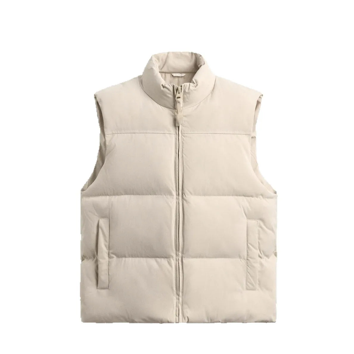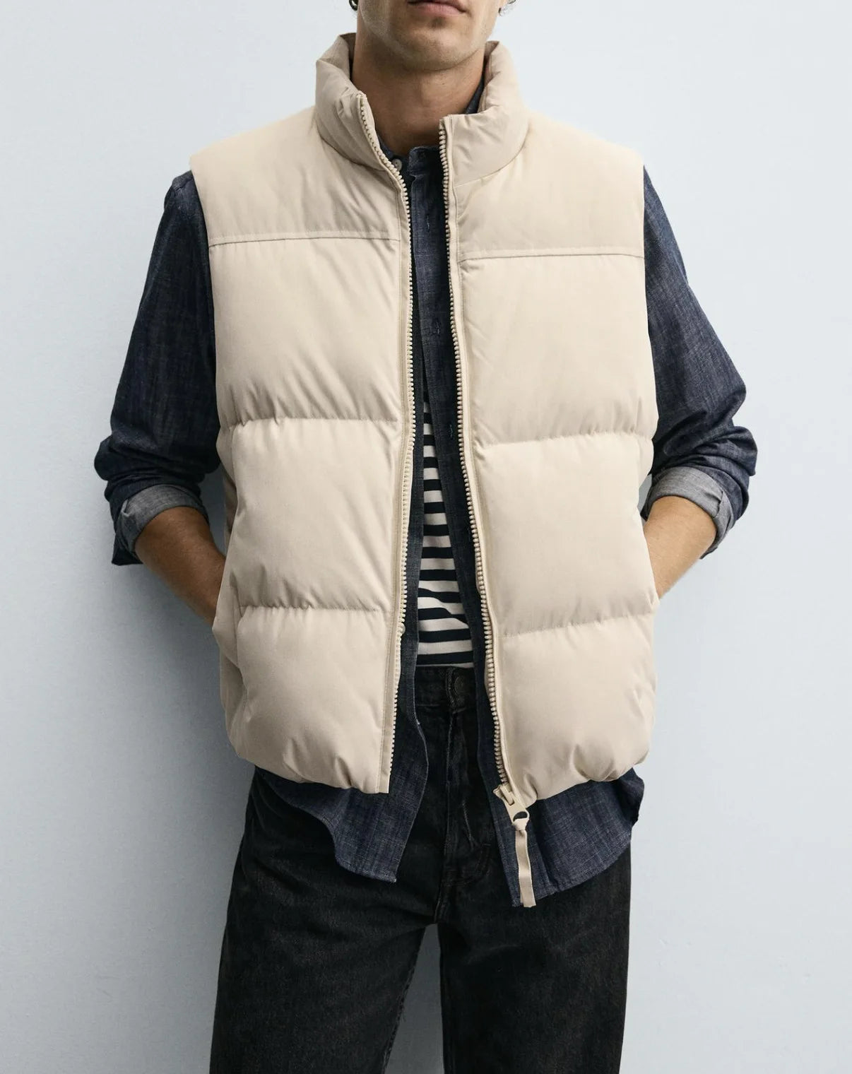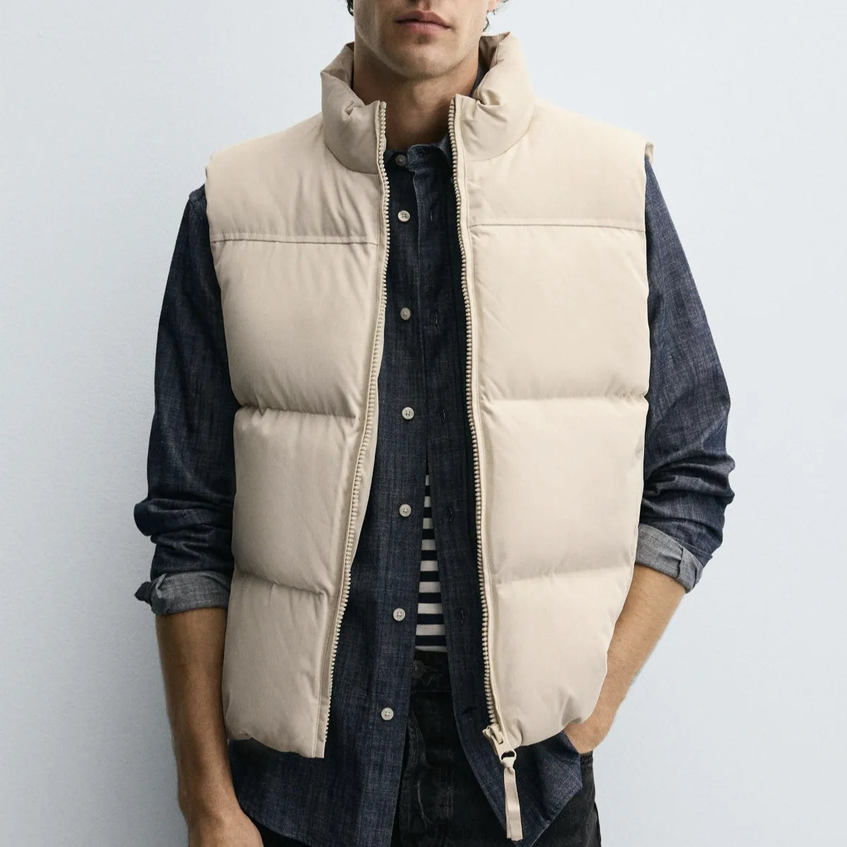 Vest. Høy krage og ermeløs, ermesøm. Paspel-lommer på hoftene. Lommedetalj på innsiden. Glidelås foran.