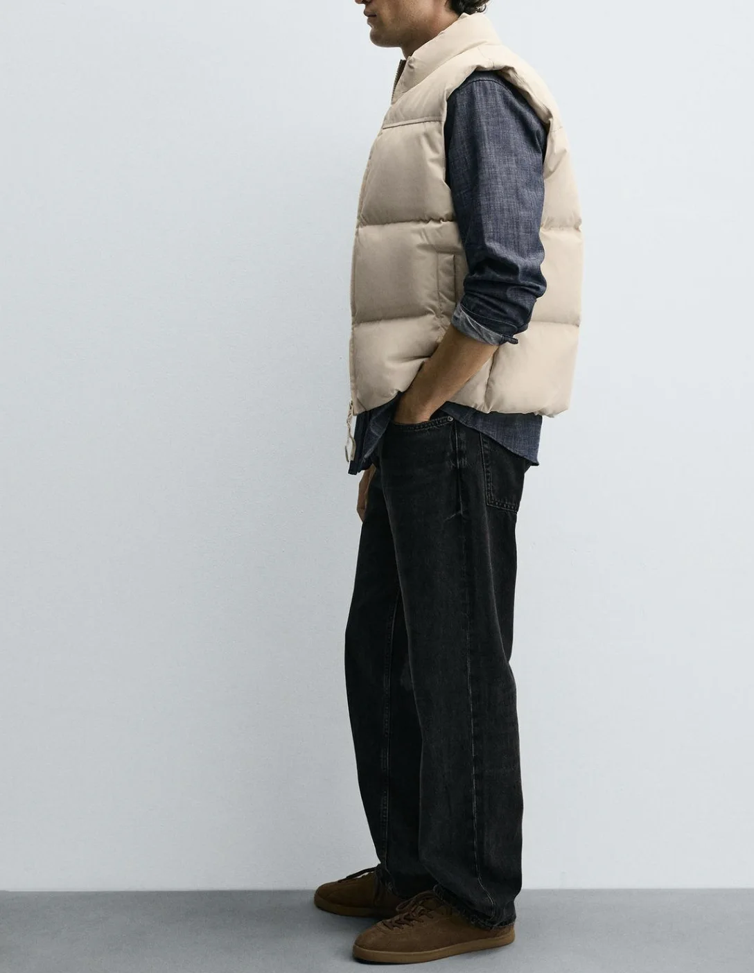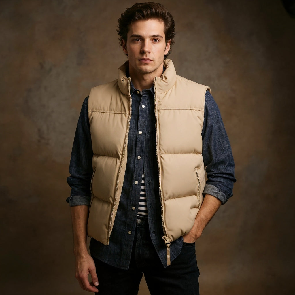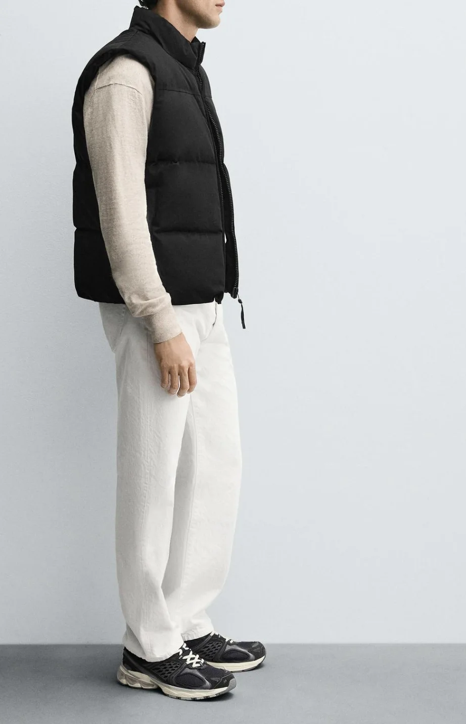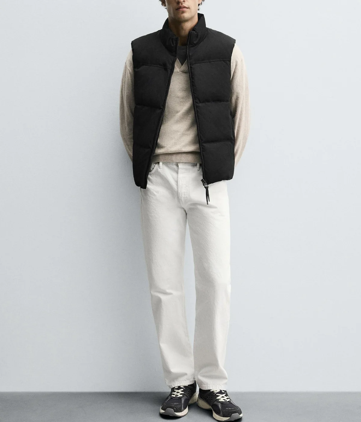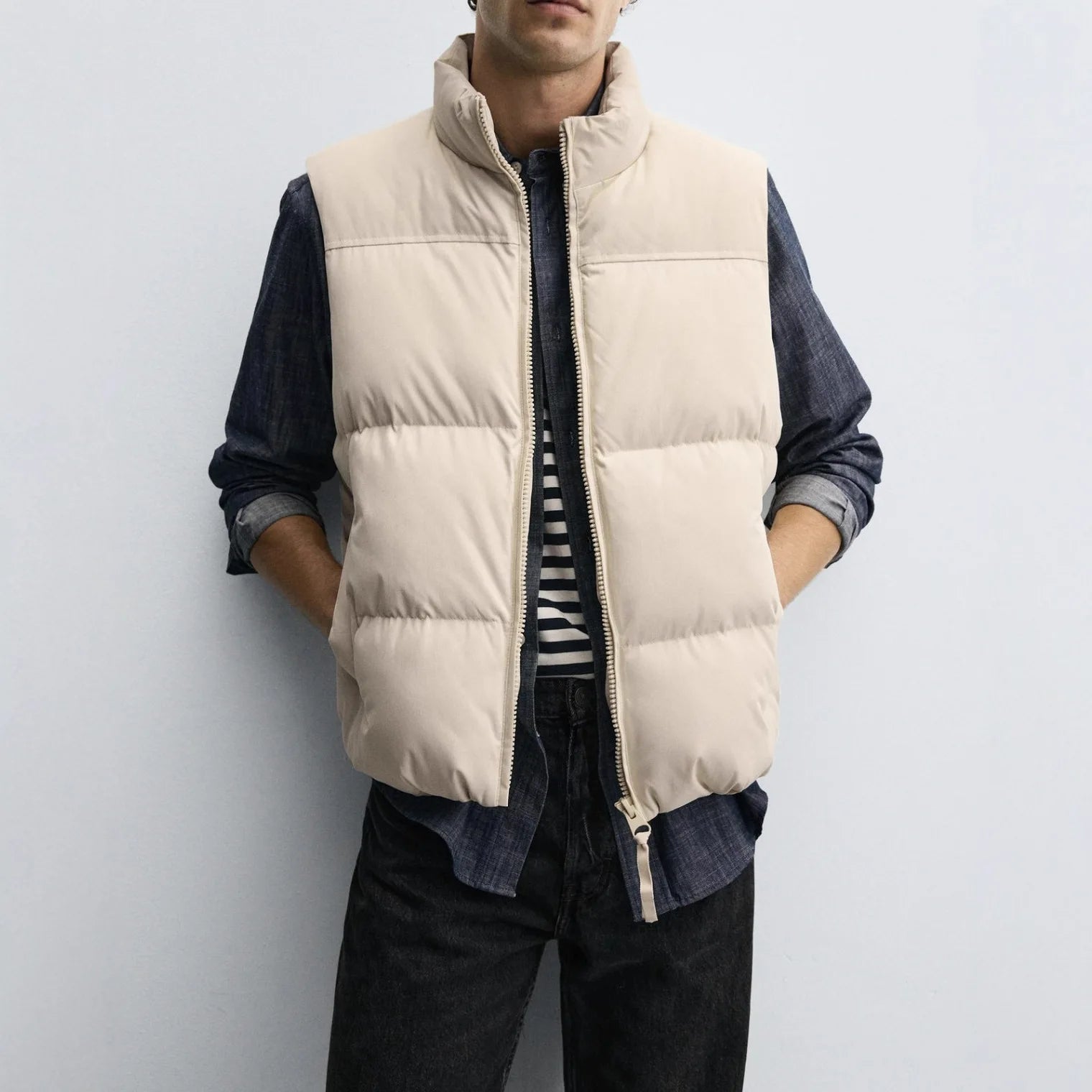 Vest. Høy krage og ermeløs, ermesøm. Paspel-lommer på hoftene. Lommedetalj på innsiden. Glidelås foran.