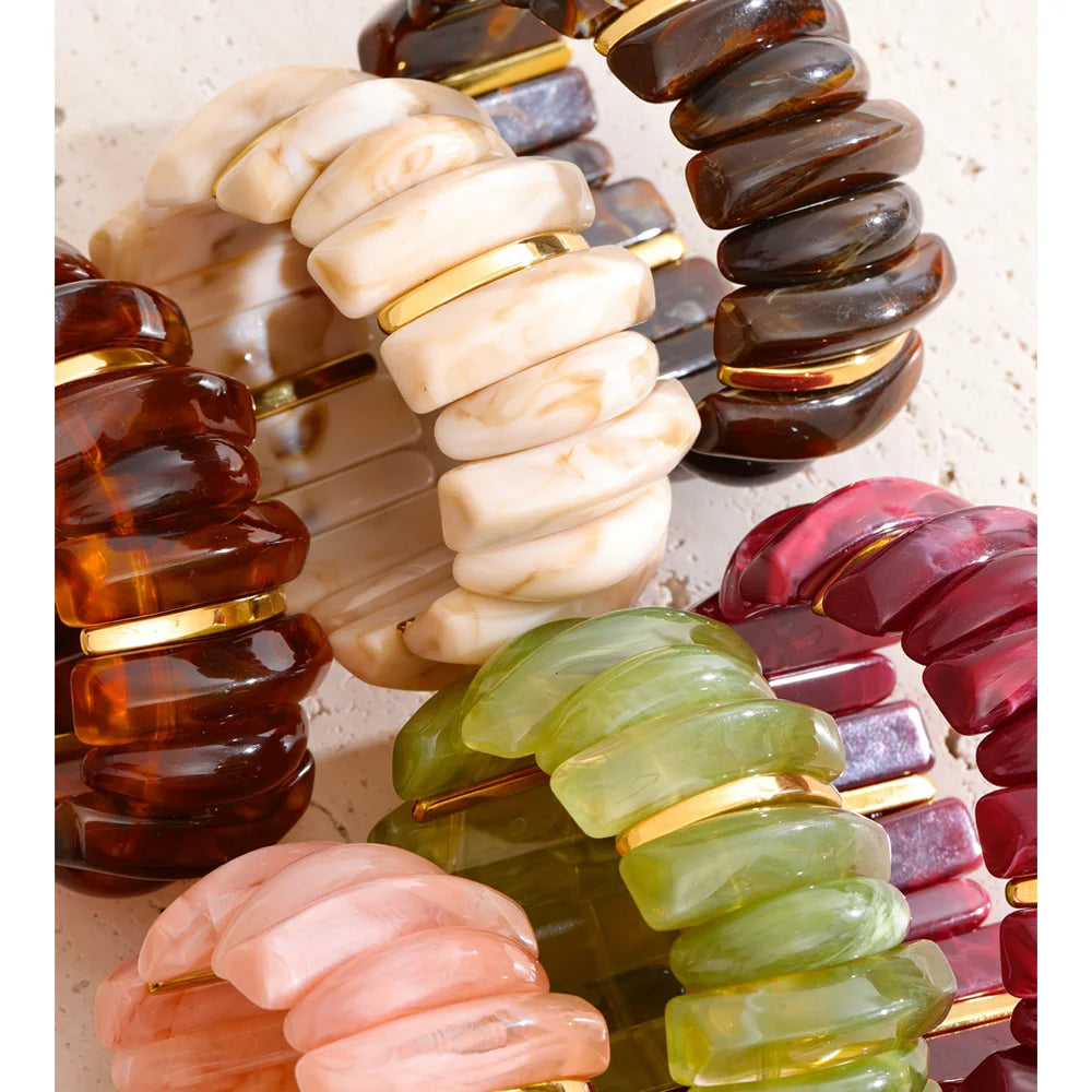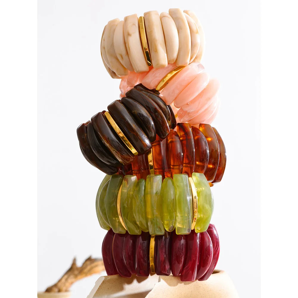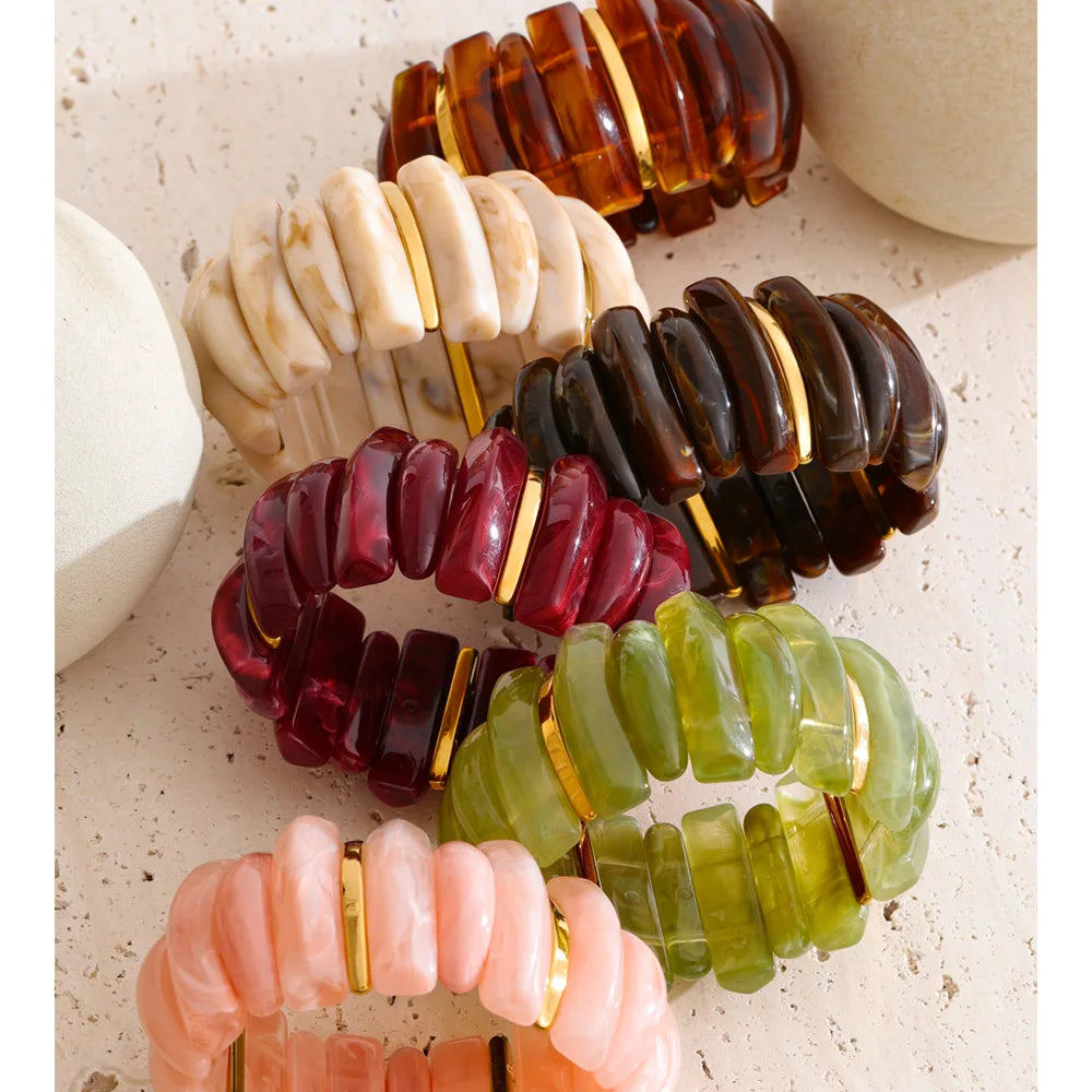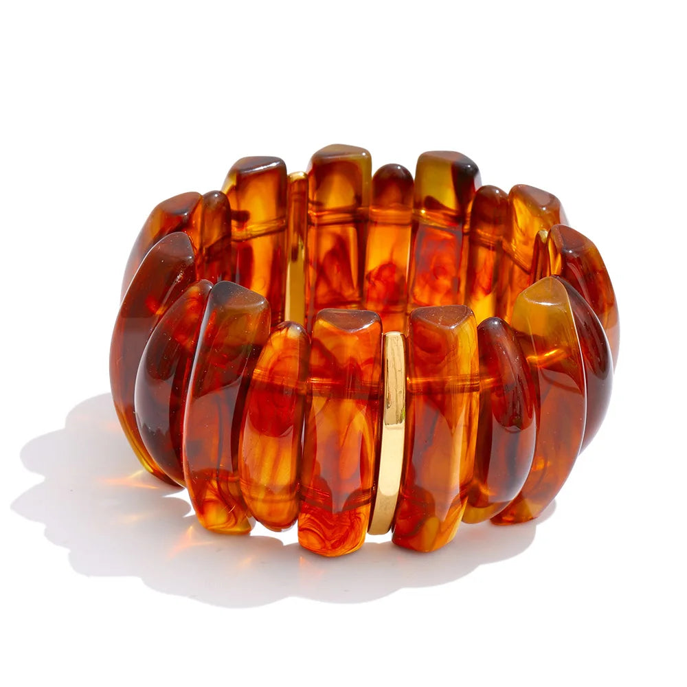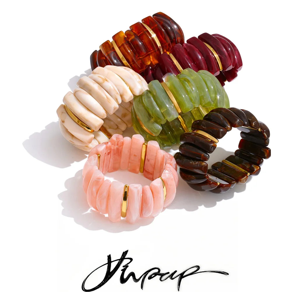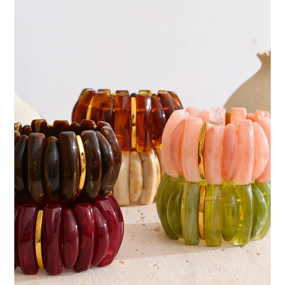 Dette brede, elegante armbåndet i akryl og rustfritt stål er laget for kvinner som ønsker å skille seg ut med et moderne og uttrykksfullt statement-smykke. Den fleksible og lette konstruksjonen gir en komfortabel passform, mens det eksklusive designet tilfører antrekket en luksuriøs og kunstnerisk touch.