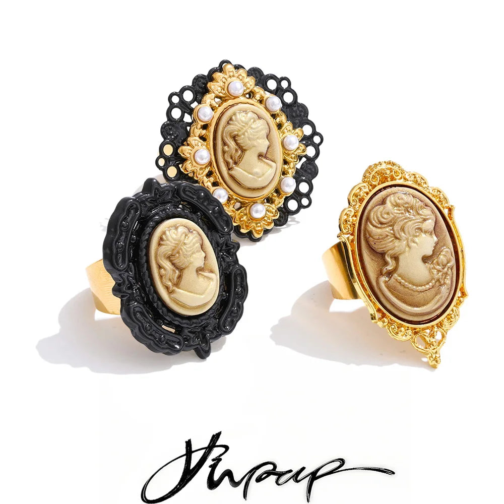En unik og elegant ring designet for kvinner som ønsker å uttrykke stil, kunst og personlighet i ett smykke. Den ovale portrettdetaljen kombinert med glansfulle resinperler og 18K gullbelagt rustfritt stål skaper et sofistikert og tidløst uttrykk.